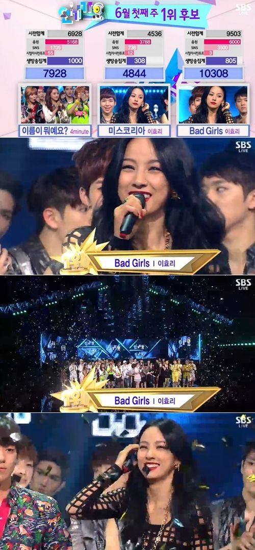 2일 생방송으로 진행된 SBS ‘인기가요’에서 이효리는 ‘미스코리아’와 ‘배드 걸스’ 2곡이 포미닛 ‘이름이 뭐예요?’와 나란히 1위 후보에 오르는 진풍경을 연출했다. 이효리는 “활동하면서 두 곡이 1위 후보가 된 게 처음”이라는 말로 기쁜 마음을 드러냈다.