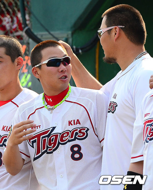 2일 오후 광주 무등구장에서 2013 한국야쿠르트 세븐프로야구 KIA 타이거즈와 LG 트윈스의 경기가 열릴 예정인 가운데 KIA 김진우가 안치홍의 삭발 머리를 만지고 있다.
