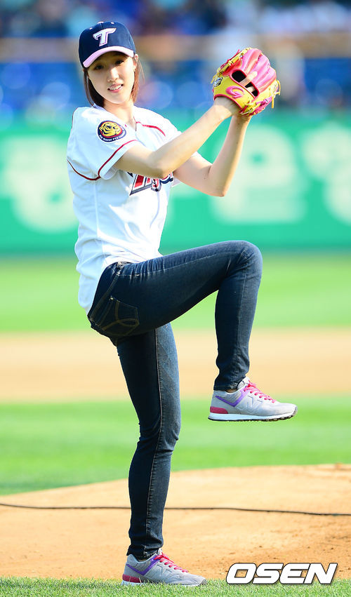 2일 오후 광주 무등구장에서 열린 2013 한국야쿠르트 세븐프로야구 KIA 타이거즈와 LG 트윈스의 경기, 경기 전 현대건설 힐스테이트 배구단의 황연주가 시구를 하고 있다.