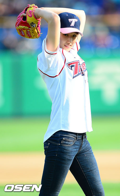 2일 오후 광주 무등구장에서 열린 2013 한국야쿠르트 세븐프로야구 KIA 타이거즈와 LG 트윈스의 경기, 경기 전 현대건설 힐스테이트 배구단의 황연주가 시구를 하고 있다.