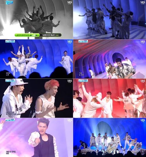 2일 생방송으로 진행된 SBS ‘인기가요’에서 엑소는 신곡 ‘늑대와 미녀’로 첫 컴백 무대를 꾸몄다. 멤버들은 흡사 늑대를 연상케 하는 강렬한 눈빛과 절도있는 퍼포먼스로 차원이 다른 무대를 완성했다. 엑소케이와 엑소엠이 결합한 완전체 무대.