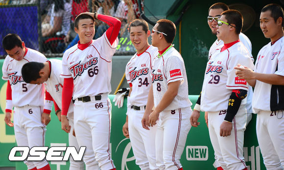 2일 오후 광주 무등구장에서 열린 2013 한국야쿠르트 세븐프로야구 KIA 타이거즈와 LG 트윈스의 경기에서 KIA 선수들이 삭발한 머리를 쑥스러워하고 있다.