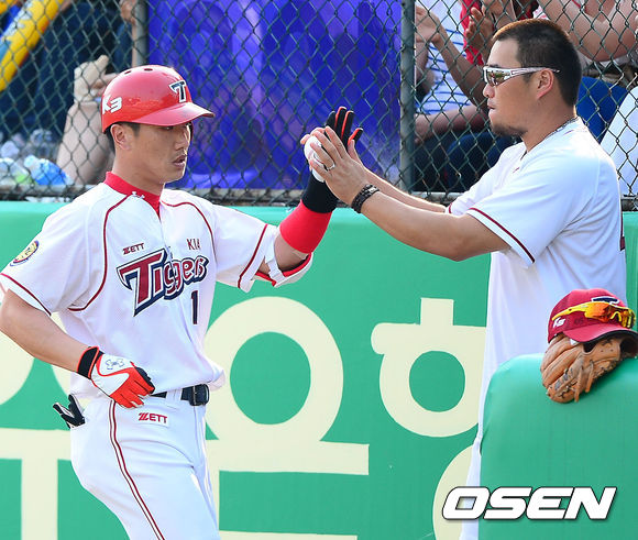 2일 오후 광주 무등구장에서 열린 2013 한국야쿠르트 세븐프로야구 KIA 타이거즈와 LG 트윈스의 경기, 1회말 무사 주자 1,2루 KIA 김주찬이 희생번트에 성공한 후 덕아웃에서 김진우와 하이파이브를 하고 있다.
