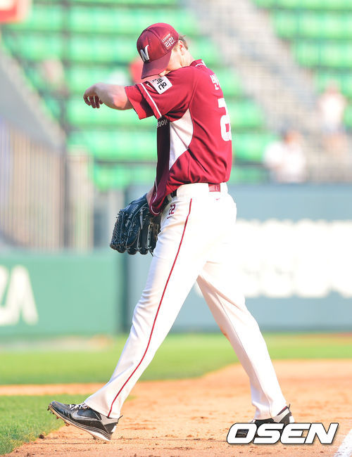 2일 오후 서울 잠실야구장에서 '2013 한국야쿠르트 세븐 프로야구' 두산 베어스 대 넥센 히어로즈의 경기가 열렸다. 3회말 두산 공격 때 4실점한 넥센 선발 벤 헤켄이 이닝을 마치고 더그아웃으로 들어가고 있다.