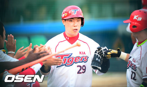 2일 오후 광주 무등구장에서 열린 2013 한국야쿠르트 세븐프로야구 KIA 타이거즈와 LG 트윈스의 경기, 4회말 1사 주자 만루 차일목의 중견수 희생플라이때 3루 주자 나지완이 홈으로 몸을 날리며 세이프된 후 덕아웃에서 동료들과 하이파이브를 하고 있다.