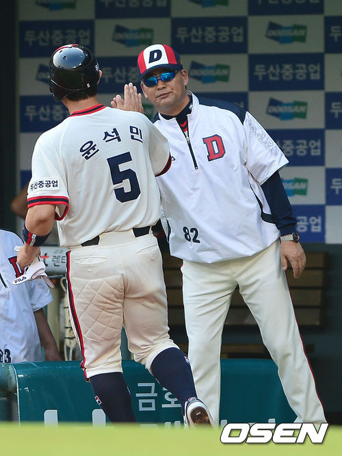 2일 오후 서울 잠실야구장에서 '2013 한국야쿠르트 세븐 프로야구' 두산 베어스 대 넥센 히어로즈의 경기가 열렸다. 5회말 두산 공격 1사 3루 상황 8번 김재호의 1타점 중전 적시타로 득점에 성공한 주자 윤석민이 김진욱 감독과 인사를 나누고 있다.