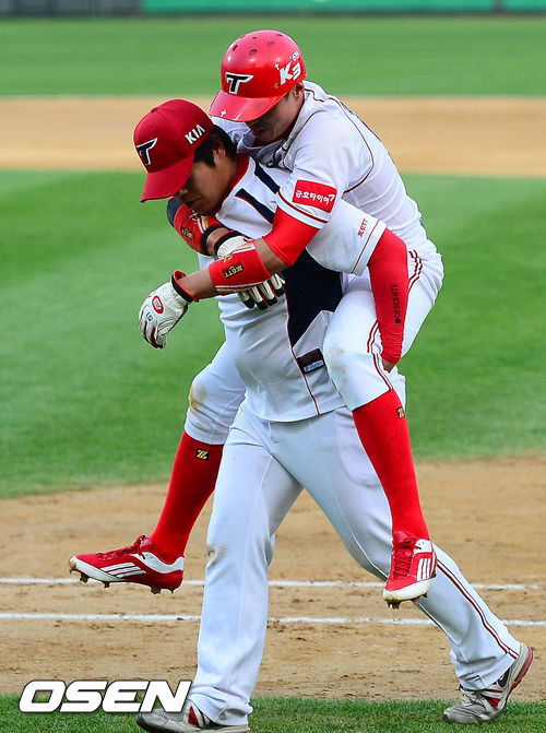 2일 오후 광주 무등구장에서 열린 2013 한국야쿠르트 세븐프로야구 KIA 타이거즈와 LG 트윈스의 경기, 6회말 2사 주자 1루 김주형 타석에서 1루 주자 김원섭이 LG 선발 리즈의 견제구때 1루로 돌아오면서 발목 부상을 입고 업혀서 교체되고 있다.
