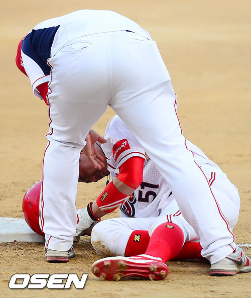2일 오후 광주 무등구장에서 열린 2013 한국야쿠르트 세븐프로야구 KIA 타이거즈와 LG 트윈스의 경기, 6회말 2사 주자 1루 김주형 타석에서 1루 주자 김원섭이 LG 선발 리즈의 견제구때 1루로 돌아오면서 발목 부상을 입고 업혀서 교체되고 있다.
