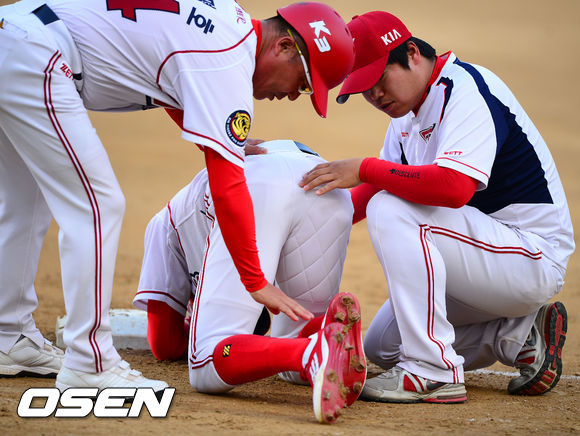 2일 오후 광주 무등구장에서 열린 2013 한국야쿠르트 세븐프로야구 KIA 타이거즈와 LG 트윈스의 경기, 6회말 2사 주자 1루 김주형 타석에서 1루 주자 김원섭이 LG 선발 리즈의 견제구때 1루로 돌아오면서 발목 부상을 입고 김평호 코치가 상태를 살피고 있다.