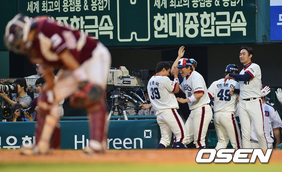 2일 오후 서울 잠실야구장에서 '2013 한국야쿠르트 세븐 프로야구' 두산 베어스 대 넥센 히어로즈의 경기가 열렸다. 8회말 두산 공격 2사 만루 상황 6번 윤석민의 2타점 좌중간 2루타로 득점에 성공한 김현수가 이종욱과 인사를 나누며 환하게 웃고 있다.