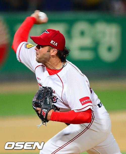 2일 오후 광주 무등구장에서 열린 2013 한국야쿠르트 세븐프로야구 KIA 타이거즈와 LG 트윈스의 경기, 8회 마운드에 오른 KIA 앤서니 힘차게 공을 뿌리고 있다.