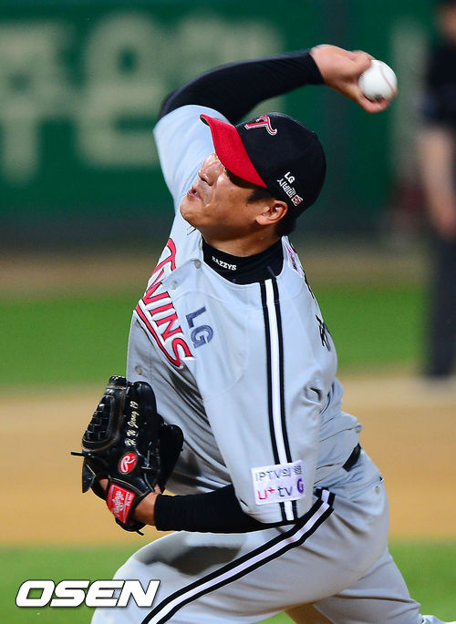 2일 오후 광주 무등구장에서 열린 2013 한국야쿠르트 세븐프로야구 KIA 타이거즈와 LG 트윈스의 경기, 8회 LG 정현욱이 힘차게 공을 뿌리고 있다.