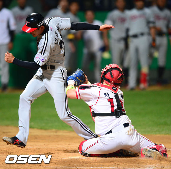 2일 오후 광주 무등구장에서 열린 2013 한국야쿠르트 세븐프로야구 KIA 타이거즈와 LG 트윈스의 경기, 9회초 2사 주자 2,3루 LG 손주인이 좌중간 동점 2타점 적시타때 2루 주자 임정우가 홈을 밟고 있다.