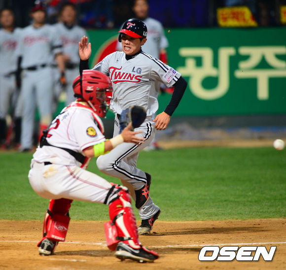 2일 오후 광주 무등구장에서 열린 2013 한국야쿠르트 세븐프로야구 KIA 타이거즈와 LG 트윈스의 경기, 9회초 2사 주자 2,3루 LG 손주인이 좌중간 동점 2타점 적시타때 2루 주자 임정우가 홈으로 달리고 있다.
