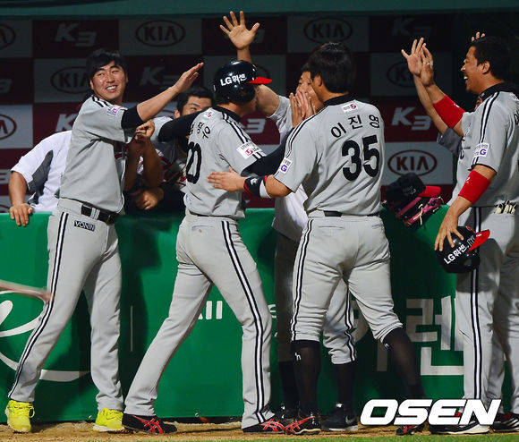 2일 오후 광주 무등구장에서 열린 2013 한국야쿠르트 세븐프로야구 KIA 타이거즈와 LG 트윈스의 경기, 9회초 2사 주자 2,3루 LG 손주인이 좌중간 동점 2타점 적시타때 홈을 밟은 임정우가 덕아웃에서 동료들과 기쁨을 나누고 있다.