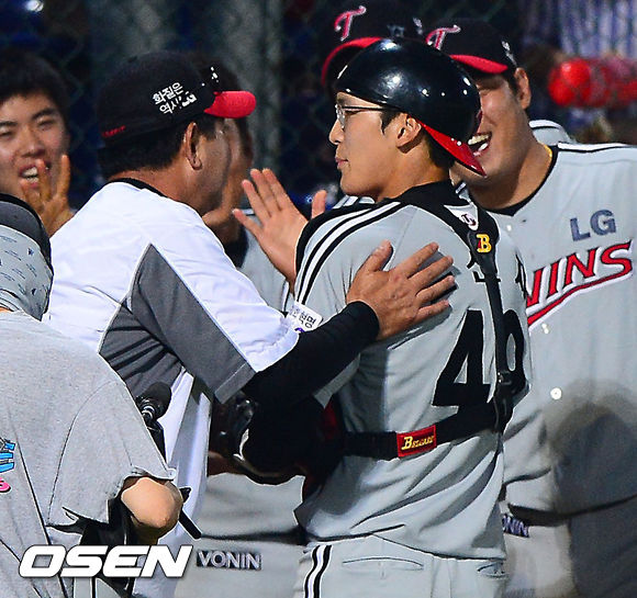 2일 오후 광주 무등구장에서 열린 2013 한국야쿠르트 세븐프로야구 KIA 타이거즈와 LG 트윈스의 경기, 9회말 1루수 문선재가 포수로 바뀐 후 9회를 마치고 덕아웃으로 들어오며 하이파이브를 하고 있다.