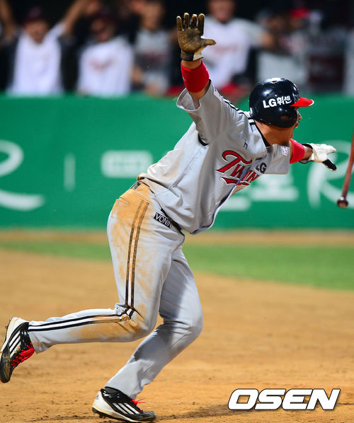 2일 오후 광주 무등구장에서 열린 2013 한국야쿠르트 세븐프로야구 KIA 타이거즈와 LG 트윈스의 경기, 10회초 2사 주자 1루 LG 문선재가 좌익수 왼쪽 역전 1타점 적시타때 이병규가 홈에서 세이프된 후 기뻐하고 있다.