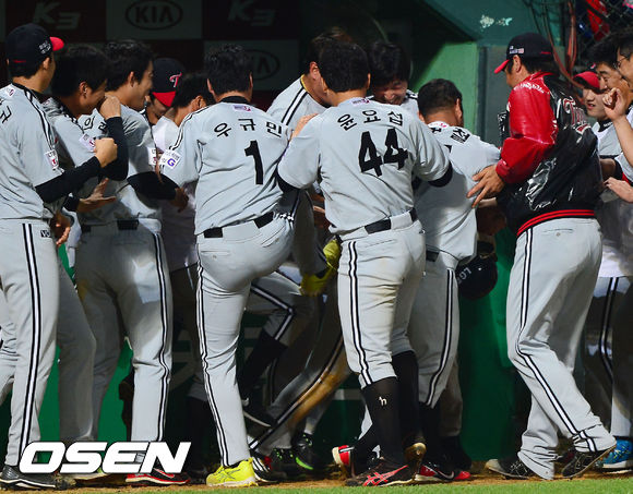 2일 오후 광주 무등구장에서 열린 2013 한국야쿠르트 세븐프로야구 KIA 타이거즈와 LG 트윈스의 경기, 10회초 2사 주자 1루 LG 문선재가 좌익수 왼쪽 역전 1타점 적시타때 이병규가 홈에서 세이프된 후 동료들과 기쁨을 나누고 있다.