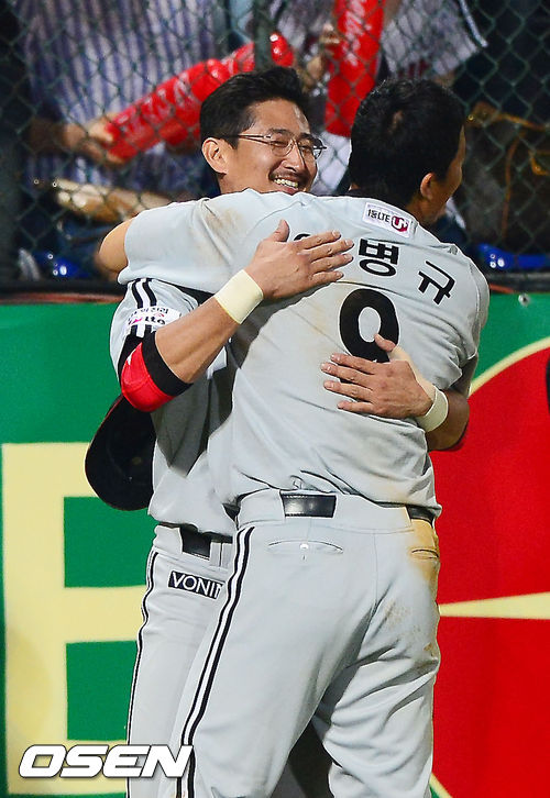 10회초 2사 주자 1루 LG 문선재가 좌익수 왼쪽 역전 1타점 적시타때 이병규가 홈에서 세이프된 후 동료들과 기쁨을 나누고 있다. / rumi@osen.co.kr