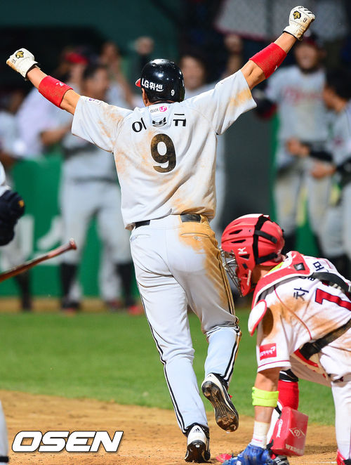 10회초 2사 주자 1루 LG 문선재가 좌익수 왼쪽 역전 1타점 적시타때 이병규가 홈에서 세이프된 후 동료들과 기쁨을 나누고 있다. / rumi@osen.co.kr