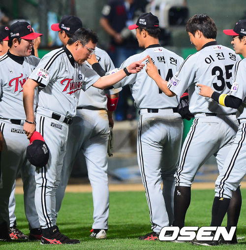 경기를 마치고 LG 김기태 감독이 선수들에게 고개를 숙여 하이파이브를 하고 있다./ rumi@osen.co.kr