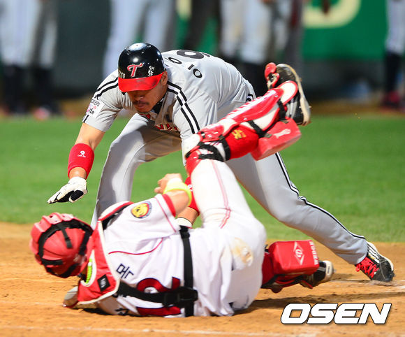 10회초 2사 주자 1루 LG 문선재가 좌익수 왼쪽 역전 1타점 적시타때 이병규가 재치 넘치는 플레이로 쓰러진 차일목의 태그를 피해 역전 득점을 올리고 있다./ rumi@osen.co.kr