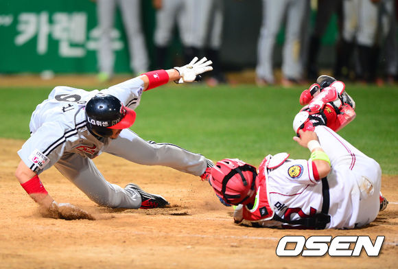 10회초 2사 주자 1루 LG 문선재가 좌익수 왼쪽 역전 1타점 적시타때 이병규가 홈에서 세이프 되고 있다./ rumi@osen.co.kr