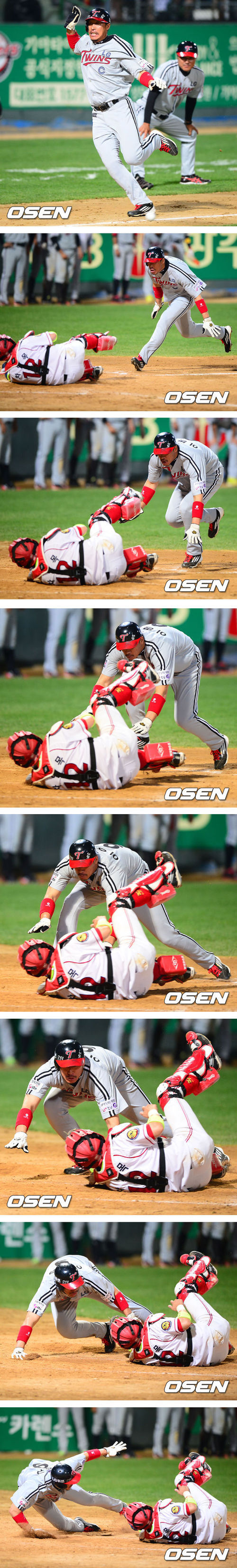 10회초 2사 주자 1루 LG 문선재가 좌익수 왼쪽 역전 1타점 적시타때 이병규가 홈에서 세이프 되고 있다./ rumi@osen.co.kr