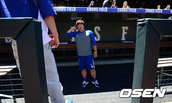 3일 새벽(이하 한국시간) 미국 콜로라도주 덴버 쿠어스 필드에서 열리는 콜로라도 로키스와 LA 다저스의 경기 시작 전 류현진이 덕아웃에서 통역사와 이야기를 나누고 있다.