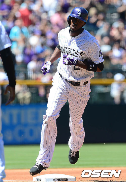 3일 새벽(이하 한국시간) 미국 콜로라도주 덴버 쿠어스 필드에서 열린 콜로라도 로키스와 LA 다저스의 경기 1회말 선두타자 파울러가 솔로포를 치고 베이스를 돌고 있다.