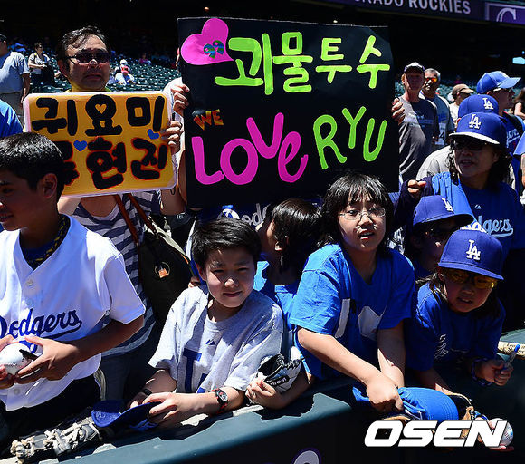 3일 새벽(이하 한국시간) 미국 콜로라도주 덴버 쿠어스 필드에서 열린 콜로라도 로키스와 LA 다저스의 경기 시작 전 한인 팬들이 류현진을 기다리고 있다.