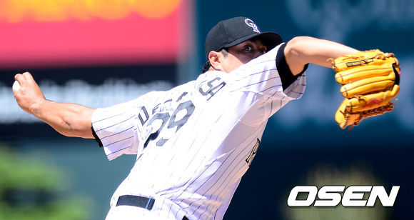 3일 새벽(이하 한국시간) 미국 콜로라도주 덴버 쿠어스 필드에서 열린 콜로라도 로키스와 LA 다저스의 경기 로키스 선발 델라로사가 역투하고 있다.