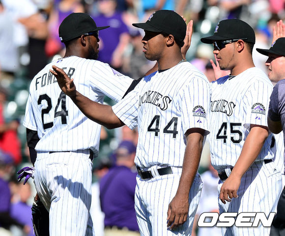 3일 새벽(이하 한국시간) 미국 콜로라도주 덴버 쿠어스 필드에서 열린 콜로라도 로키스와 LA 다저스의 경기 종료 후 로키스 선수들이 하이파이브를 하고 있다.