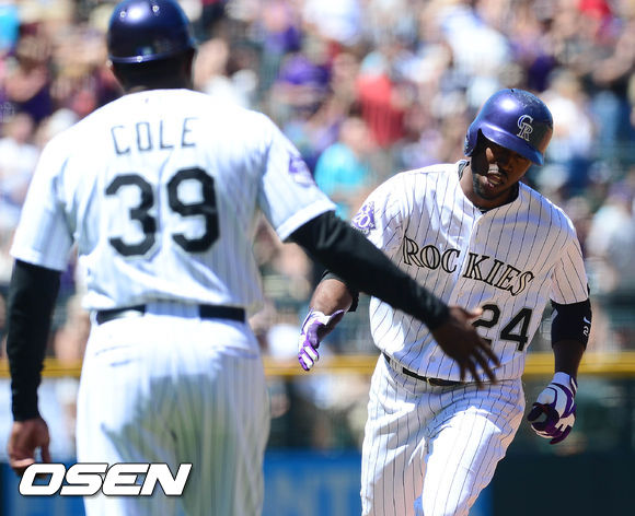 3일 새벽(이하 한국시간) 미국 콜로라도주 덴버 쿠어스 필드에서 열린 콜로라도 로키스와 LA 다저스의 경기 1회말 선두타자 파울러가 솔로홈런을 친 후 콜 코치와 하이파이브를 하고 있다.