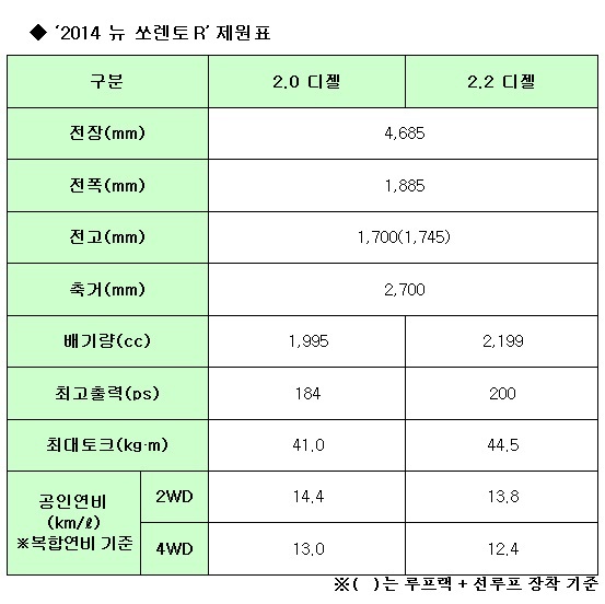 ‘2014 뉴 쏘렌토R’의 가격은 디젤 R2.0 2WD 5인승이 2,705만원~3,295만원, 디젤 R2.0 4WD 5인승이 3,105만원~3,505만원이며, 디젤 R2.2 2WD 7인승이 3,057만원~3,467만원, 디젤 R2.2 4WD 7인승이 3,272만원~3,682만원이다. (전 모델 자동변속기 적용)