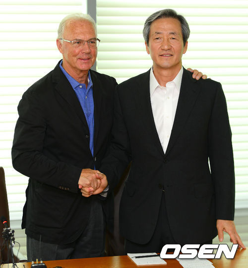 프란츠 베켄바워(68) 바이에른 뮌헨 명예회장이 3일 방한했다. 베켄바워 명예회장은 서울 신문로 아산정책연구원에서 정몽준(62) 대한축구협회 명예회장을 만나 기자회견을 갖고, 독일정부가 정몽준 명예회장에게 수여하는 독일 대십자 공로훈장(Commander's Cross of the Order of Merit)의 추천 이유와 축구 발전을 위한 양국간의 협력 방안 등을 밝혔다.