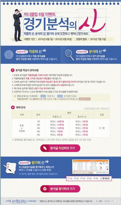 이밖에 회원들이 작성한 리그집중분석글을 평가하는 회원에게는 '평가의 신' 이벤트를 통해 모두 10명에게 벳머니 1만원권을 증정한다. 단, 평가는 발매 중인 게시글에 한해 가능하다.