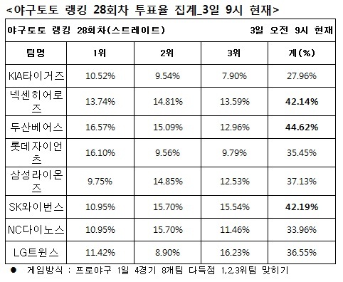 국민체육진흥공단(www.kspo.or.kr)이 발행하는 체육진흥투표권 수탁사업자인 스포츠토토 공식발매사이트인 베트맨(www.betman.co.kr)은 오는 4일에 개최되는 LG-두산, 넥센-삼성, 롯데-KIA, NC-SK 등 4경기 8개팀을 대상으로 한 야구토토 랭킹 28회차 스트레이트 게임 중간집계결과 두산(44.62%), SK(42.19%), 넥센(42.14%)을 차례로 다득점 상위 3개팀으로 꼽았다고 밝혔다. 반면 NC(33.96%), KIA(27.96%)는 가장 적은 득점을 기록할 것으로 예상했다.