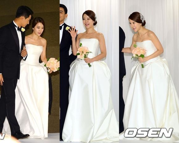 특히 임신 4개월 차에도 허리가 꼭 맞게 피트 되고 허리 밑은 풍성하게 퍼지는 볼가운 스타일의 웨딩드레스를 입었다. 화려한 장식 없는 깔끔함으로 신부의 우아한 매력이 돋보였다. 이뿐 아니라 백지영은 피치빛 부케로 순수하고 청순한 이미지를 발산했다.