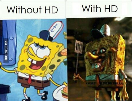 사진 속에는 미국의 유명 애니메이션 '스폰지밥 네모바지'의 주인공 스폰지밥의 두 가지 모습이 나온다. 좌측은 모두가 잘 알고 있는 스폰지밥의 귀여운 모습이고, 우측은 HD 스폰지밥인데 다소 섬뜩한 표정을 짓고 있다.