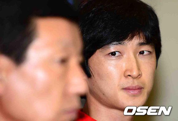 3일 오후(한국시간) 레바논 베이루트 홀리데이인 호텔에서 열린 한국 축구국가대표팀 기자회견에서 한국 곽태휘가 최강희 감독을 바라보고 있다.