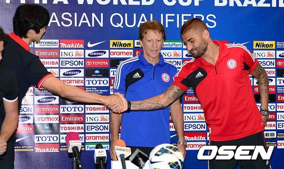 3일 오후(한국시간) 레바논 베이루트 홀리데이인 호텔에서 열린 한국 축구국가대표팀 기자회견에서 한국 곽태휘와 레바논 유세프 모하메드가 인사를 나누고 있다.