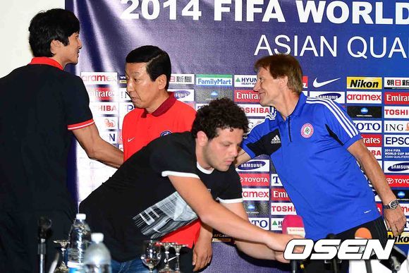 3일 오후(한국시간) 레바논 베이루트 홀리데이인 호텔에서 열린 한국 축구국가대표팀 기자회견에서 레바논 테오 부커 감독이 한국 곽태휘와 인사를 나누고 있다.