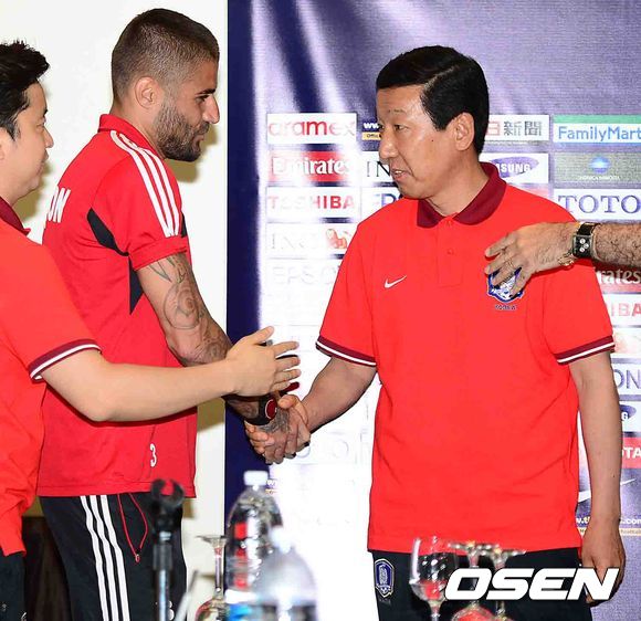 3일 오후(한국시간) 레바논 베이루트 홀리데이인 호텔에서 열린 한국 축구국가대표팀 기자회견에서 한국 최강희 감독이 레바논 유세프 모하메드와 인사를 나누고 있다.