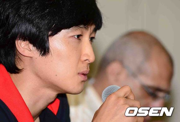 3일 오후(한국시간) 레바논 베이루트 홀리데이인 호텔에서 열린 한국 축구국가대표팀 기자회견에서 한국 곽태휘가 취재진의 질문에 답을 하고 있다.