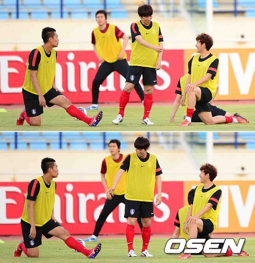 4일 새벽(한국시간) 레바논 베이루트 카밀 샤문 스포츠시티 스타디움에서 열린 한국 축구국가대표팀의 훈련, 훈련 중 김보경이 김신욱 손흥민과 장난을 치고 있다.