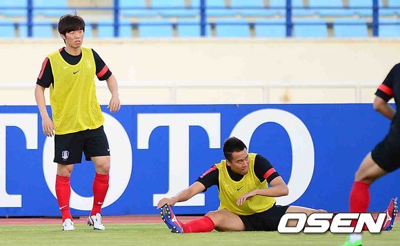 4일 새벽(한국시간) 레바논 베이루트 카밀 샤문 스포츠시티 스타디움에서 열린 한국 축구국가대표팀의 훈련, 김보경과 김신욱이 스트레칭 훈련을 하고 있다.