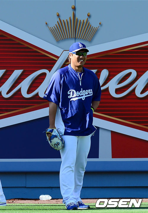 4일 오전(이하 한국시간) 미국 캘리포니아주 로스앤젤레스 다저스타디움에서 열리는 LA 다저스와 샌디에이고 파드리스의 경기 시작 전 류현진이 훈련 중 미소를 짓고 있다.