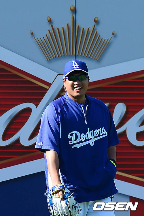 4일 오전(이하 한국시간) 미국 캘리포니아주 로스앤젤레스 다저스타디움에서 열리는 LA 다저스와 샌디에이고 파드리스의 경기 시작 전 류현진이 훈련 중 미소를 짓고 있다.