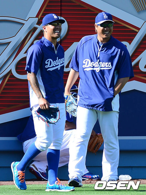 4일 오전(이하 한국시간) 미국 캘리포니아주 로스앤젤레스 다저스타디움에서 열리는 LA 다저스와 샌디에이고 파드리스의 경기 시작 전 류현진이 외야에서 동료들과 장난을 치고 있다.